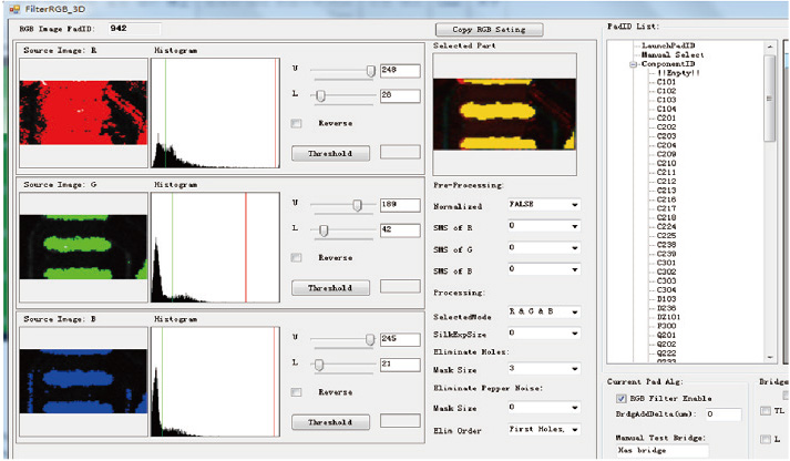 The RGB Tune feature of the patent employs the separate capture of red, green, and blue color images, combined with a unique color filtering algorithm. This perfectly addresses bridging misjudgment and relative reference plane uncertainty issues. It simultaneously provides 2D/3D measurement results and colored solder paste images. Coupled with the 2D illumination source, it effectively eliminates the distortion of the RGB color effect caused by the red light angle. The RGB calibration for different substrate colors significantly enhances the device\\\\\\\'s repeatability accuracy in terms of height, volume, and area.