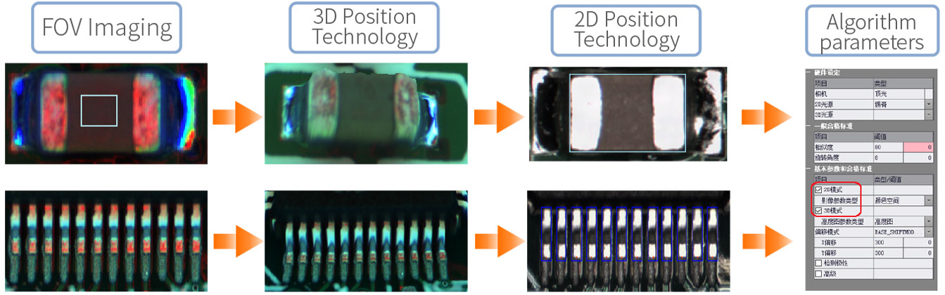 3DAOI uses 3D body positioning technology, assisted by 2D positioning technology, to ensure accurate body and pin positioning of components such as Chip and IC, and accurate body positioning of dark colored special components etc.