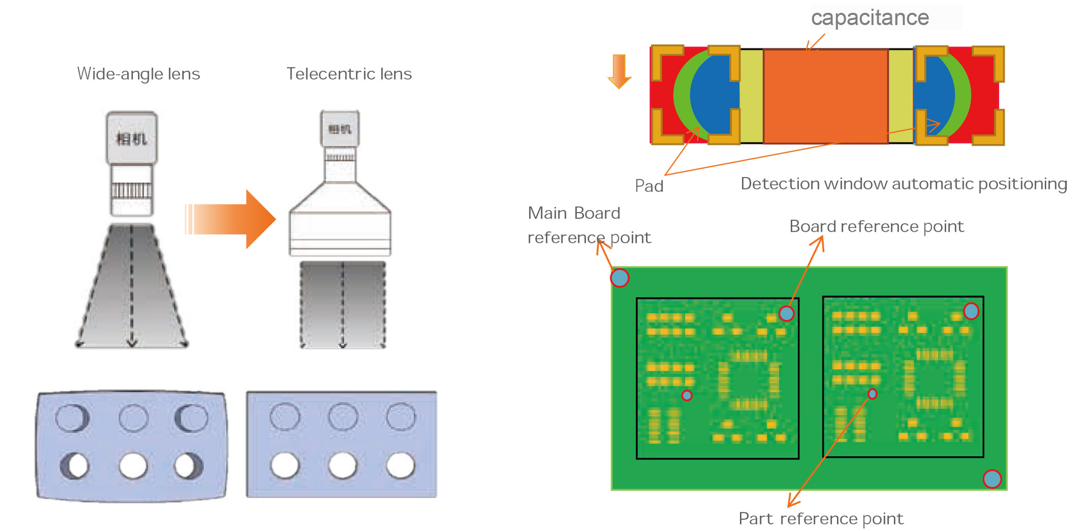 AOI uses telecentric lens without distortion effect, adopts multi-reference point calibration method, and automatic positioning of detection window, including double positioning of pad and body, which solves the problem of offsetcaused by board deformation and greatly reduces false alarms.