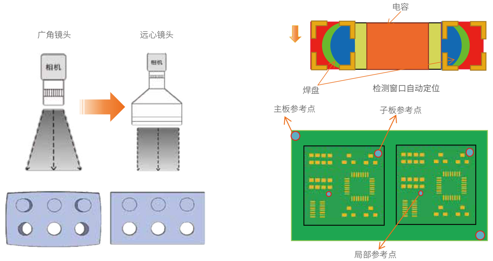 AOI使用無畸變效果的遠心鏡頭,采用多參考點的校準方式,以及檢測窗口自動定位,包含焊盤跟本體的雙重定位,解決了板變形帶來的偏框問題,大大降低了誤報!
